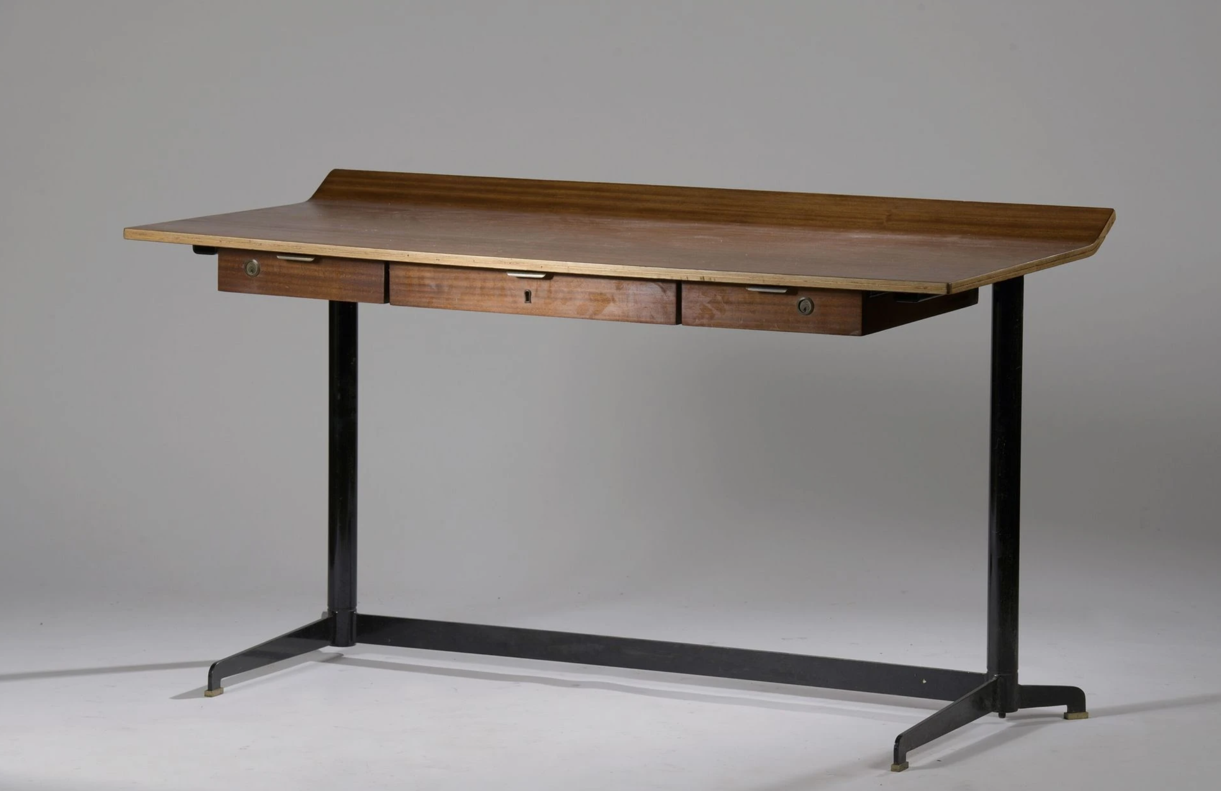 T90 is the original writing desk designed by Osvaldo Borsani in Canaletto walnut and black painted base.